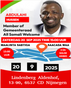 Asalaama caleykum Ogeysiis: Mededeling (wargelin) waxaan walaalaha degan magaalada nijmegen Gobolka Gelderland uu ka jiro doono kulan guud ee soomalida degan looga arinsan doono guushii Xildhibaankeen Abdulaahi Huseen ( Hanad) xisbiga Groenelinks uu casumaad usameeyey walaalaga degan magaalada sida dhalinyarada , dumaraka ,ragga , odoyaasha iyo caruurtaba dhamaan ka soo qaygal wacan .